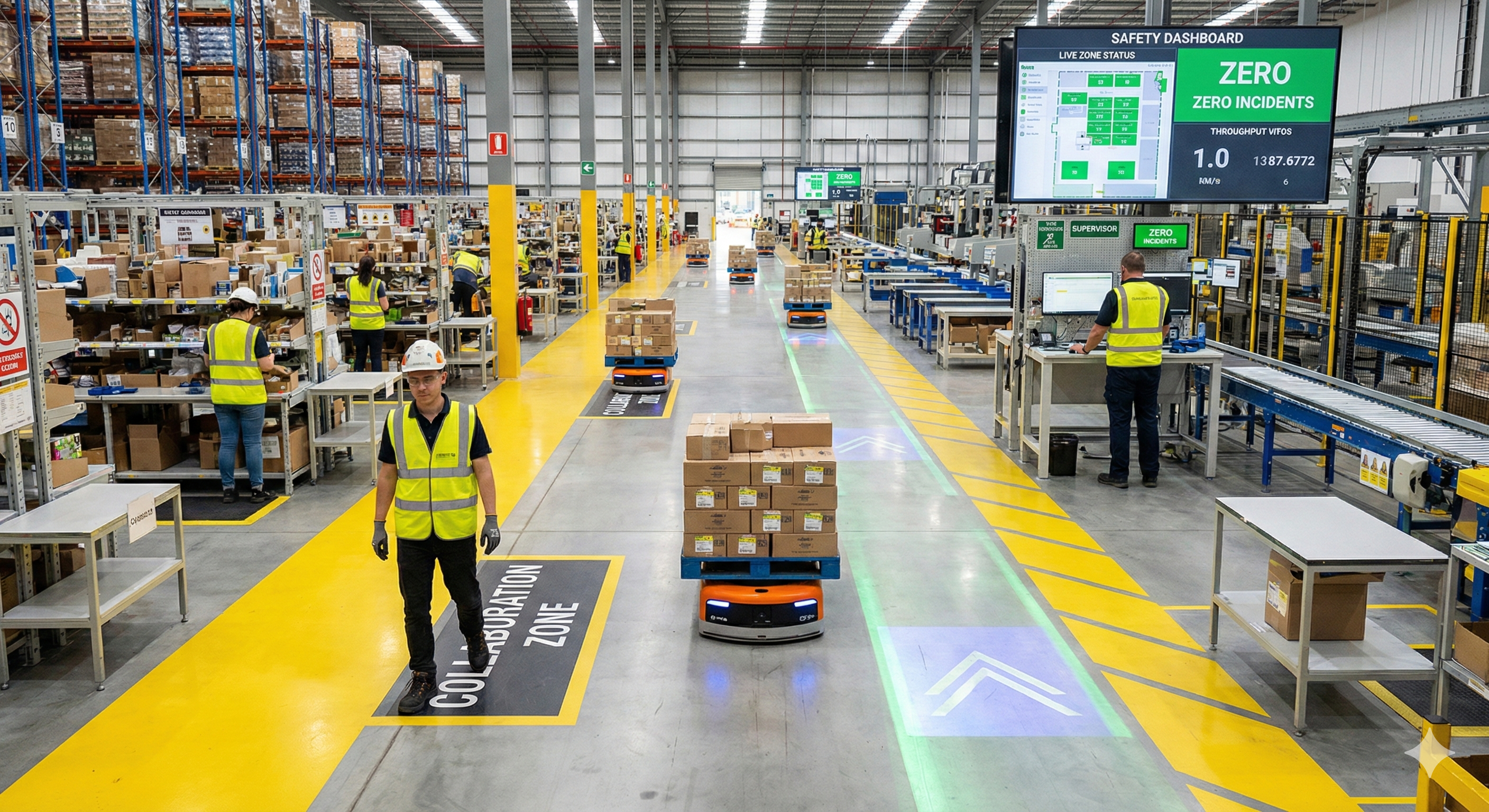 Clear safety zones and protocols. Safety-first design in collaboration zones, better peak scalability.